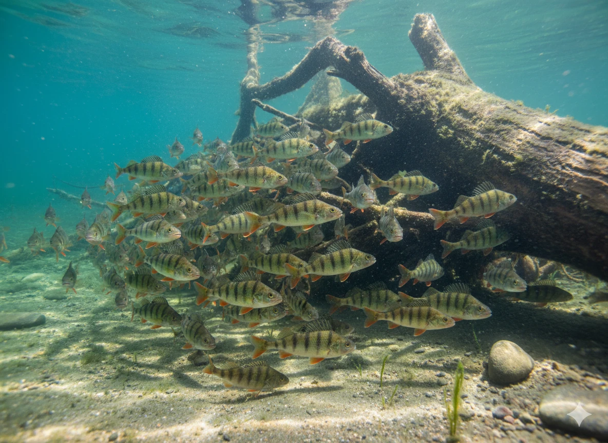The perch (Perca fluviatilis) is a commonly found freshwater fish belonging to the perch family. It is characterized by distinct dark stripes on its body and a coloration ranging from greenish to yellow-brown. Typically, it grows up to 30 cm in length but can reach larger sizes. The perch is a predator that primarily feeds on smaller fish, insects, and crustaceans. It inhabits lakes, rivers, and reservoirs across Europe and Asia. The perch prefers waters with moderate oxygen levels and abundant aquatic vegetation, which provides shelter and hunting grounds. It is valued by anglers and chefs alike for its tasty flesh and sporting qualities.